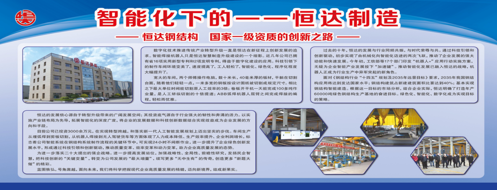 山西恒達鋼結構工程有限公司始建于1998年,位于國家歷史文化名城、晉商故里——山西祁縣,緊鄰208國道,坐落于省級經濟開發區,毗鄰喬家大院景區,地理環境優越,交通十分便利。現有廠區占地面積200余畝,建筑面積60000平方米。 我公司是一家從事研發、銷售、制造和施工于一體的大型鋼結構工程企業,同時也是涂鍍鋼品及配套建筑圍護材料系統的專業生產廠商。多年來,逐漸確立了以商務寫字樓、賓館、高層住宅等為主的高層鋼結構建筑體系,以大型煤倉、高鐵車站、體育場館等公共建筑為主的空間大跨度鋼結構建筑體系,以工業廠房、低溫物流庫、多層鋼結構建筑等為主的輕鋼結構建筑體系。 我公司現擁有數條輕鋼結構加工生產線、重型鋼結構加工生產線、箱型梁柱加工生產線,同時配套有全自動巖棉保溫復合板生產線、高鐵聲屏障、抑風墻生產線,數控C型鋼生產線及各種規格的壓型板生產線三十余條,擁有年鋼結構加工8萬噸、鋼結構圍護面積120萬平方米的生產能力, [ 查看詳情 ]